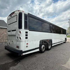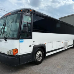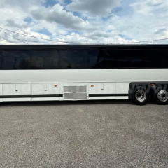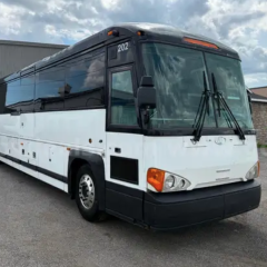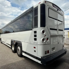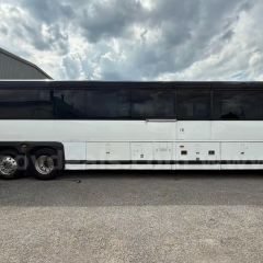 Functional wheelchair lift, 6 overhead TV monitors, electronic destination sign (programmable), undercarriage storage, parcel racks, stereo, and PA system.